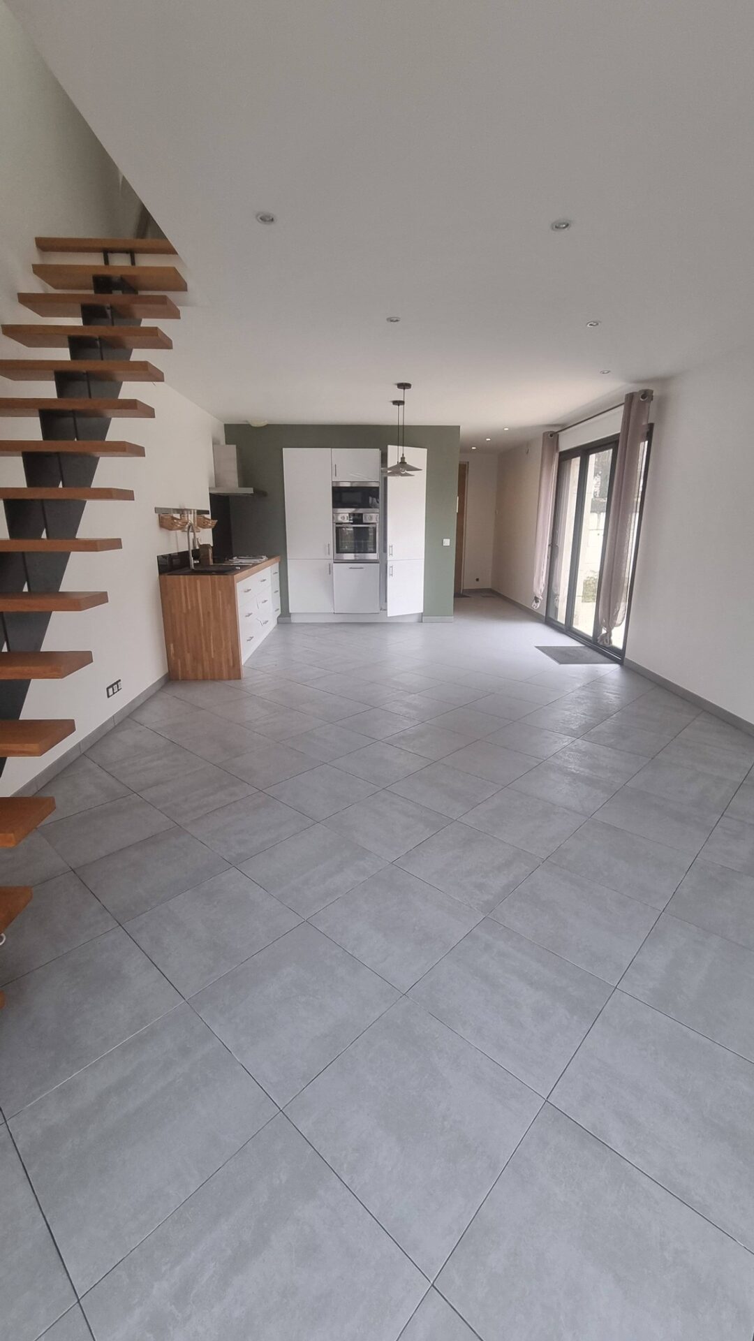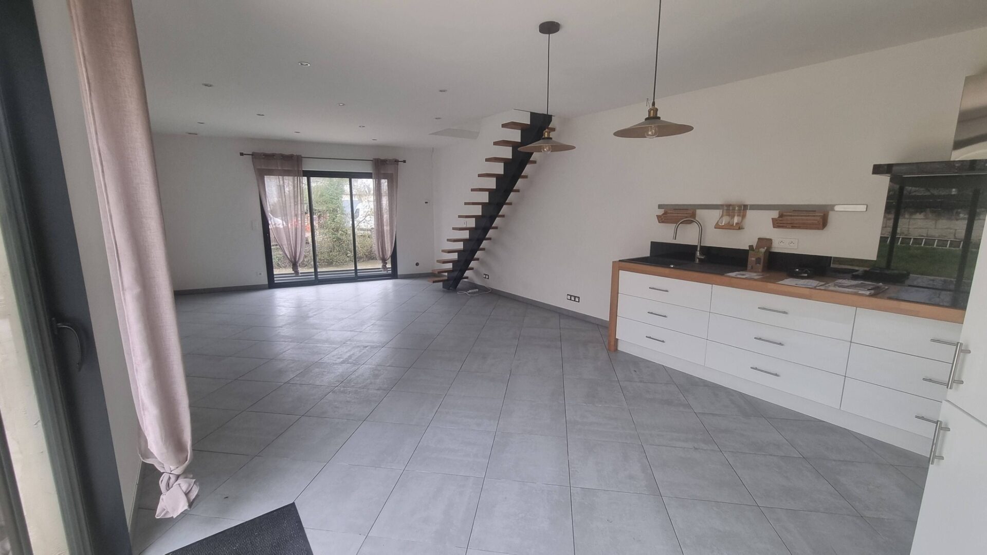 Vous trouverez au rez de chaussée une entrée, cellier/buanderie, wc, séjour ouvert sur cuisine aménagée de 33 m² donnant sur la terrasse.